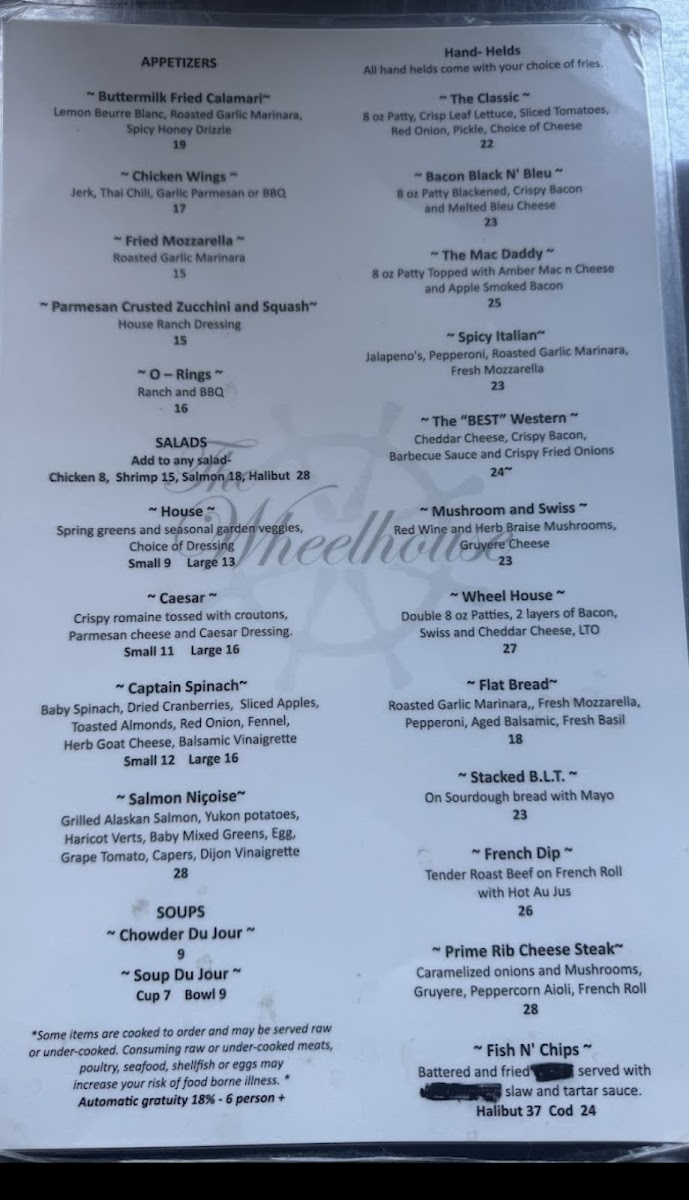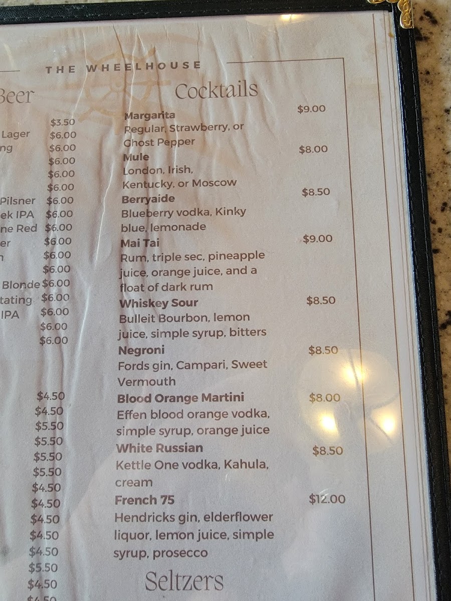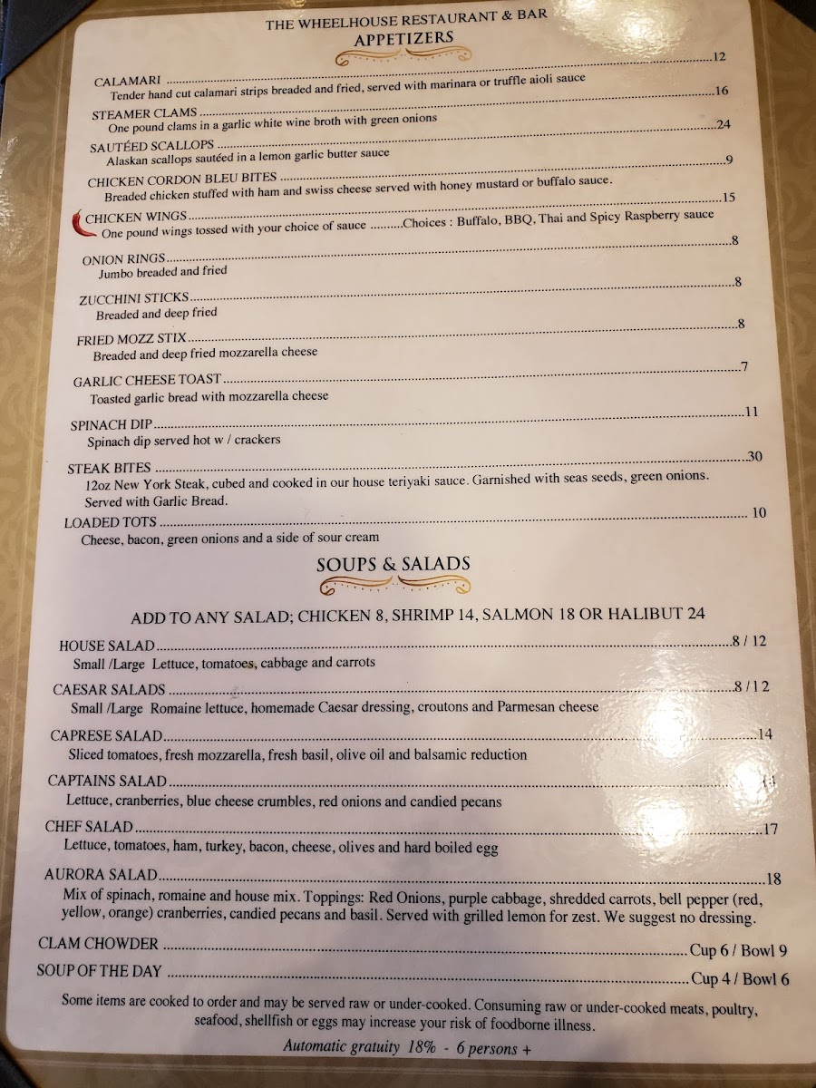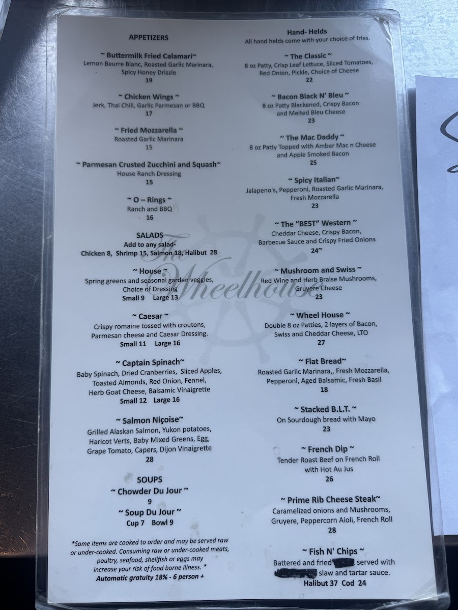 The menu at The Wheelhouse offers a delightful variety of dishes that cater to different tastes and preferences. For appetizers, you can start with the crispy Parmesan Crusted Zucchini And Squash. When it comes to salads, the Captain Spinach stands out as a fresh option. If you're in the mood for something hearty, the Bacon Black N' Bleu hand-held is sure to satisfy. For drinks, the restaurant serves a range of cocktails, including classics like the Margarita, Mule, and Whiskey Sour, alongside some inventive options such as BerryaideMai Tai. Meat lovers can indulge in tender cuts like the Filet Mignon or the 14oz NY Strip steak. Seafood enthusiasts will enjoy a selection of Alaskan specialties, such as Alaskan Halibut And Chips, Alaskan King Crab, and the flavorful Alaskan Seafood Cioppino. The restaurant also offers pasta and rice dishes like the Alaskan Seafood Risotto, Blue Belle, and the classic Carnival Alfredo. For something lighter, the 6" Grinders from the deli section, including the Balto and The Tooty Fruity, are perfect for a quick meal. A variety of fries, including Straight Fries, Sweet Potato Fries, and Franks Fries, are available as sides to complement your dish. And to finish, don’t forget to try one of the fresh salads, such as the House Salad or the more indulgent Chef Salad. The Wheelhouse brings together a well-rounded menu that perfectly combines comfort food with Alaskan delicacies.