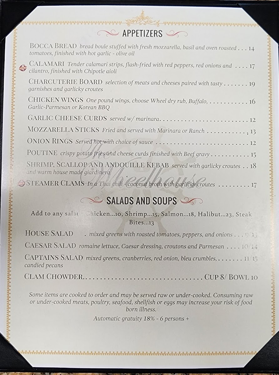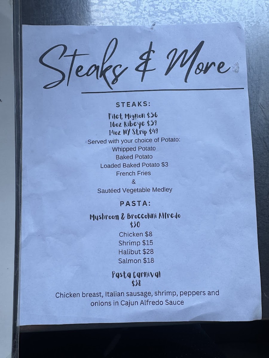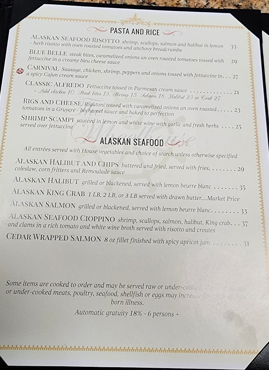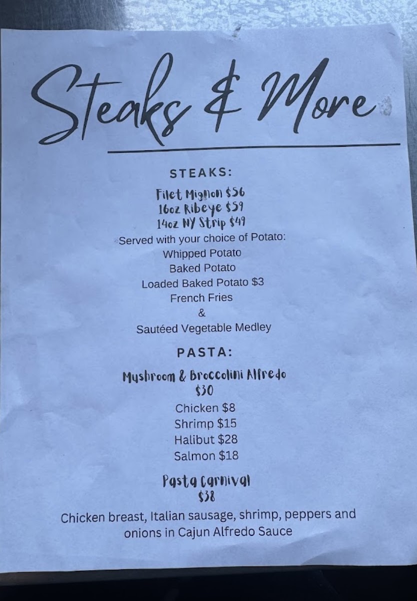 The menu at The Wheelhouse offers a delightful variety of dishes that cater to different tastes and preferences. For appetizers, you can start with the crispy Parmesan Crusted Zucchini And Squash. When it comes to salads, the Captain Spinach stands out as a fresh option. If you're in the mood for something hearty, the Bacon Black N' Bleu hand-held is sure to satisfy. For drinks, the restaurant serves a range of cocktails, including classics like the Margarita, Mule, and Whiskey Sour, alongside some inventive options such as BerryaideMai Tai. Meat lovers can indulge in tender cuts like the Filet Mignon or the 14oz NY Strip steak. Seafood enthusiasts will enjoy a selection of Alaskan specialties, such as Alaskan Halibut And Chips, Alaskan King Crab, and the flavorful Alaskan Seafood Cioppino. The restaurant also offers pasta and rice dishes like the Alaskan Seafood Risotto, Blue Belle, and the classic Carnival Alfredo. For something lighter, the 6" Grinders from the deli section, including the Balto and The Tooty Fruity, are perfect for a quick meal. A variety of fries, including Straight Fries, Sweet Potato Fries, and Franks Fries, are available as sides to complement your dish. And to finish, don’t forget to try one of the fresh salads, such as the House Salad or the more indulgent Chef Salad. The Wheelhouse brings together a well-rounded menu that perfectly combines comfort food with Alaskan delicacies.